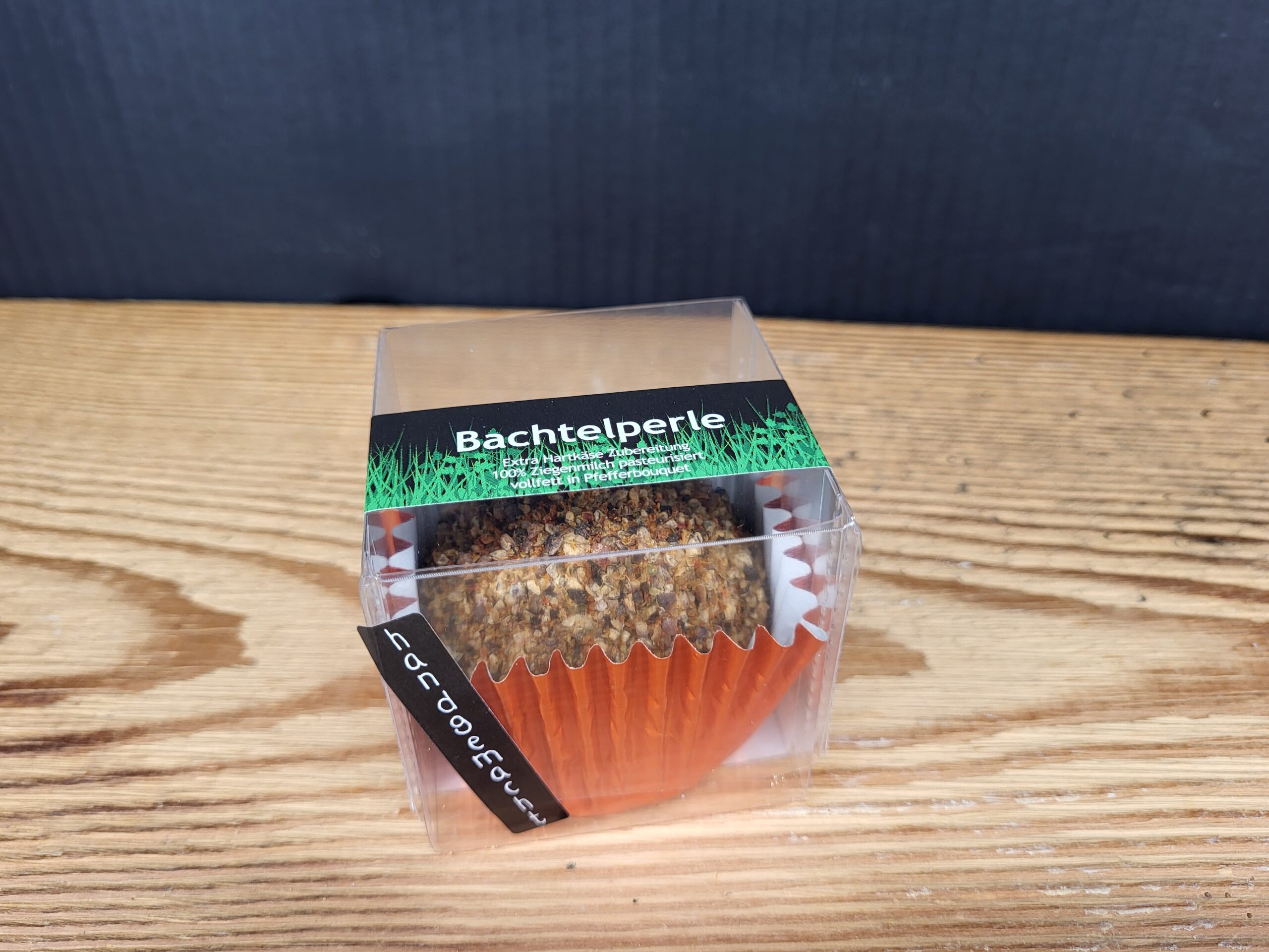 Die Bachtelperle wird von Hand aus gesalzenem Ziegenfrischkäse zu einer Kugel geformt und mit einem Pfeffermantel umhüllt. Sie reift über mehrere Monate zum Extrahartkäse und kann geraffelt oder gehobelt über Pasta, Risotto, Polenta oder Suppe verwendet werden. Die Perle wird in eine Klarsicht Schachtel verpackt und ist so auch als besondere Geschenks Idee geeignet.